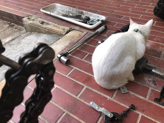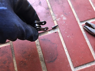 ちょっと猫に気を取られて肝心のチェーンがボケてしまってますが、ディスクグラインダーで10秒ほど削ってピンの頭をなくしたものです。