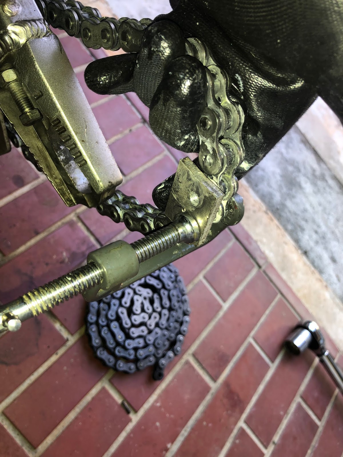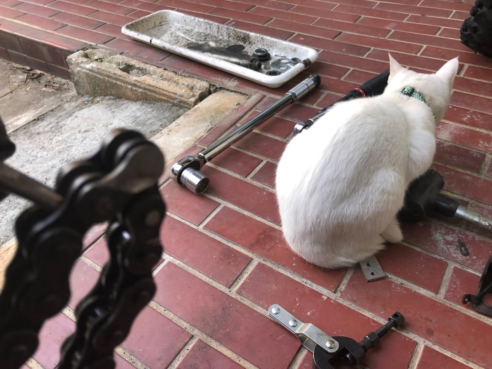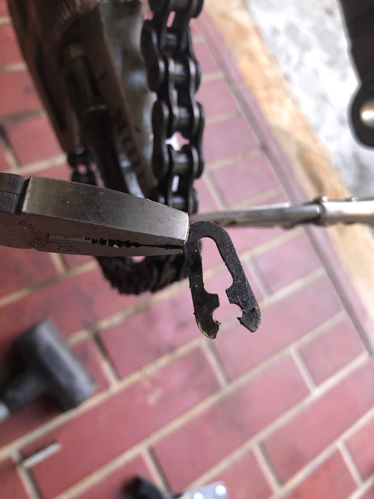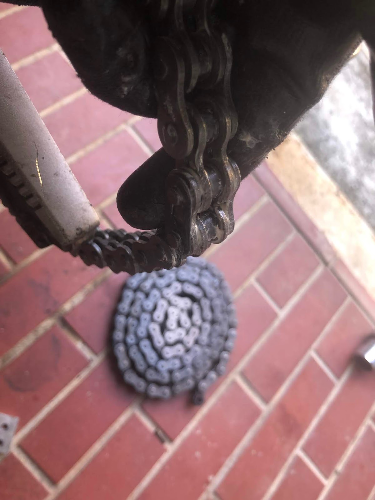 ちょっと猫に気を取られて肝心のチェーンがボケてしまってますが、ディスクグラインダーで10秒ほど削ってピンの頭をなくしたものです。