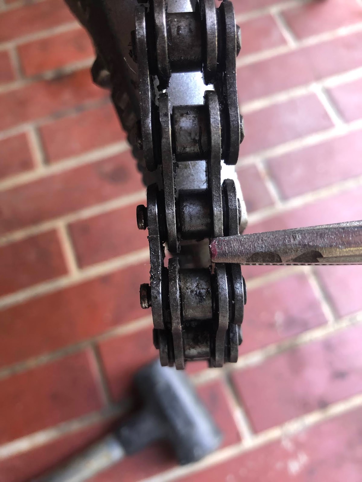 1、どこでもいいので、チェーンを繋いでいるピンの頭を1カ所削る。